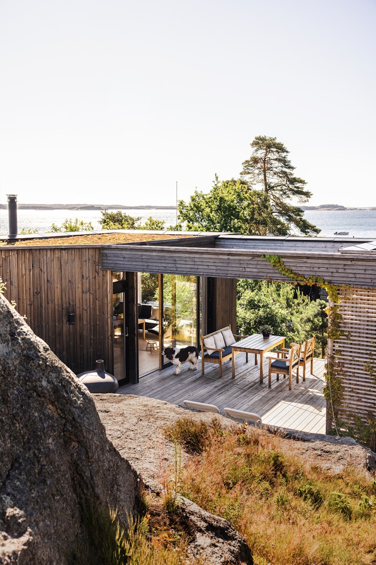The cabin gently folds around a large rock, whilst a portal frame the archipelago of Østerøya.