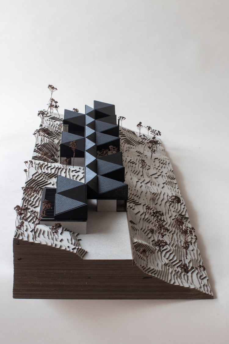 The project is placed on a hillside, in a pine forrest next to a beautiful lake. The floor plan is laid out as a walk through the landscape, encountering different views and spatial qualities along the path. The building is organized as a series of small houses along this path. The villa is designed with strict yet playful geometry, creating a variety of spatial qualities and - surprises.